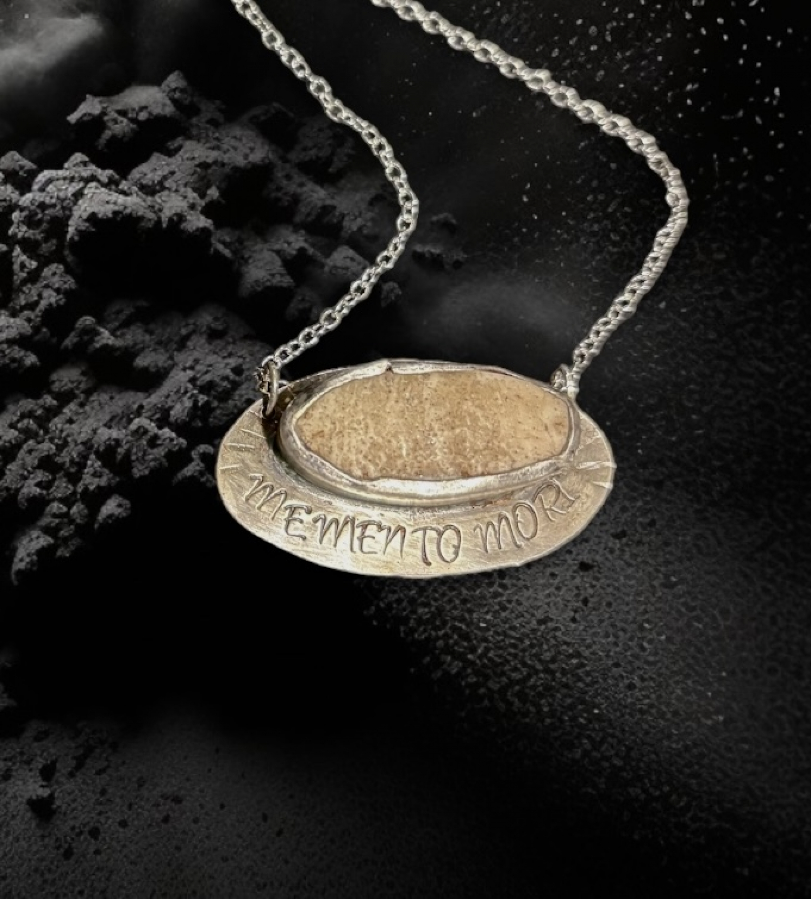 Memento Mori pendant with a handsawn section of human skull measuring approximately .75x1.5". The skull section is set in handcut 22 gauge sterling silver with a sterling bezel, and stamped with the phrase "memento mori".