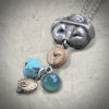 Detailed vintage silver round Buddha bead with double-sided image, accented with a drilled cork disc, bezel set jade, a goldtone spiral, and a small turquoise nugget. Amulets offer peace and protection to the wearer. The bead itself is from the mid-twentieth century and was made in Thailand.